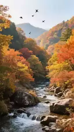- Autumn exclusive: mountains covered with red and yellow leaves interwoven, reflected in clear streams, like a fairyland