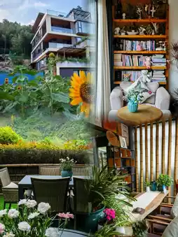 The homestay consists of a four-story building with a simple yet elegant exterior that blends perfectly with the surrounding landscape. A babbling brook flows in front, with a crescent-shaped sandy peninsula by the water—perfect for barefoot walks on its fine, soft sand. Surrounded by bamboo groves, the scenery changes with the seasons: tender green shoots in spring, lush and cool in summer, poetic golden leaves in autumn, and a fairy-tale-like silver world in winter.