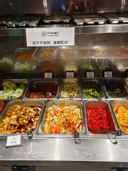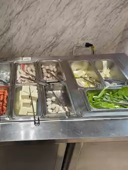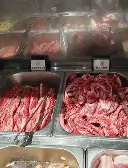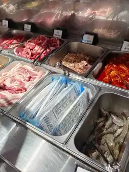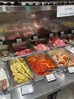 The menu includes a variety of meats, seafood, side dishes, hot pot ingredients, hot dishes, and ice cream—all self-serve!
