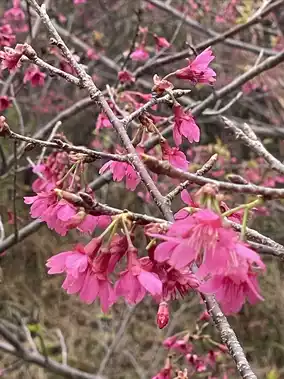 The cherry blossoms in Yinghua Valley in Xinfeng County, Guangdong Province bloom successively from January to March. Now it is mid-February, and the winter cherry blossoms are in full bloom, with clusters of purple-red flowers swaying in the spring mist. The flower trees are planted along hills of different sizes, with highs and lows, creating a sense of layering. Unfortunately, there has been no rain in recent months, and the grass on the ground is withered and messy. If the grass sprouts green buds, and the red and green colors are matched, the scenery here should be more beautiful.