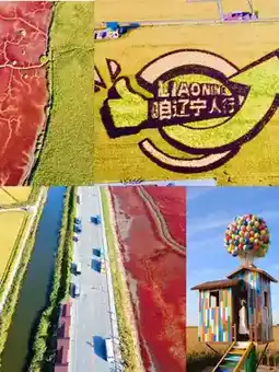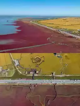 Red Beach is located in the southwest of Panjin City, Liaoning Province, at the mouth of the Liao River, known as the 'World Red Coastline'. Here, the Red Beach is characterized by wetland resources and reed marshes as the background.