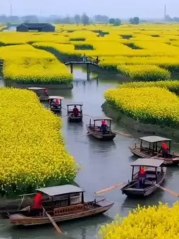 You must take a wooden boat, leisurely walking through the sea of flowers, listening to the gurgling sound of the oars crossing the water, the fragrance of rapeseed flowers lingering on the tip of your nose, as if the whole world has slowed down. The boat moved forward slowly, reaching out to touch the tender yellow petals, and in a trance, it became a part of this spring scenery.