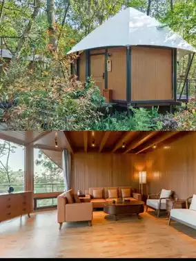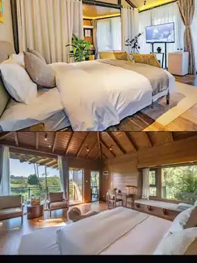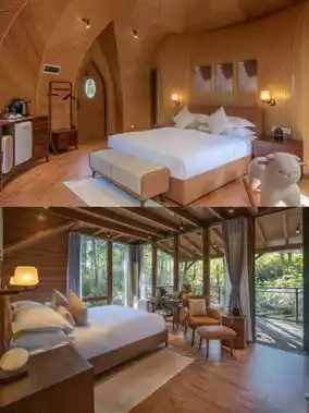 The hotel is nestled in the Yuntun National Forest Health and Wellness Base, with guest rooms scattered like stars among the forest and lawns. When you stay here, you'll wake up to greenery and breathe in the freshness of the plants and trees. Whether it's a romantic tent room or a fun-filled tree house, each room has a huge terrace and floor-to-ceiling windows with views of the forest, and you can almost touch the clouds ☁