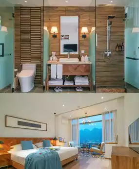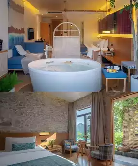 Here, even drinking water becomes art! Every morning, the staff brings dew-kissed Luofan Village white tea with Bouyei five-color glutinous rice cakes. The highlight? The owner's signature "Landscape Tea Ceremony"—floating Wanfenglin's reflection in a bronze basin while sipping tea as ripples dance. Literally drinking the whole landscape! (Check out my immersive experience in pic 3)