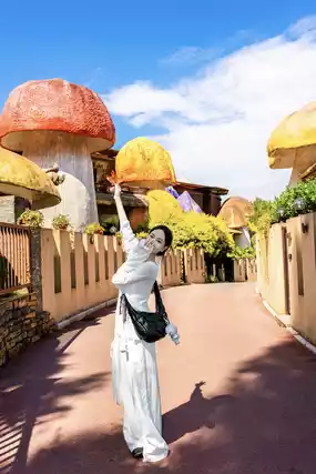 In the green wilderness of Qianxinan, there is a glowing mushroom castle! The Sunshine Valley Resort in Guizhou Chun Scenic Area uses the four primary colors of red, yellow, blue, and green to splash the fantastic scenes of "Alice in Wonderland" into reality—the domed mushroom houses have creamy cloud-patterned roofs, vines weave rainbows on candy-colored walls, and even the air is filled with the sweet scent of fairy tale bubbles.