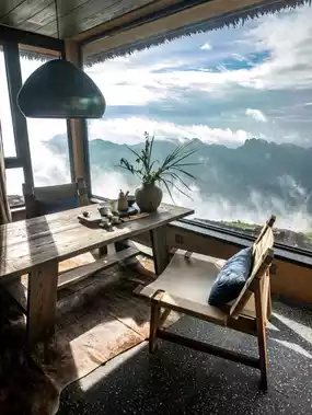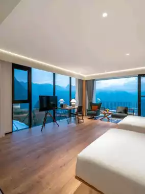 The hotel is located in Group 2, Changchong Village, Zherong Town, hidden within a natural cave atop a mountain. Opening the door reveals breathtaking views of Wanfeng Lake and the layered mountain ranges. The most unforgettable moment is in the early morning when swallows return to their nests outside the window, filling the valley with vitality. It feels deeply connected to nature, and even breathing feels fresher. The air here is excellent, and at night, the only sounds are the chirping of insects and birds, making it ideal for travelers wanting to shed their burdens and forget urban stress.