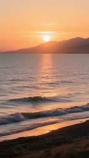 🌅 Golden lake surface, birds flying by, prayer flags fluttering