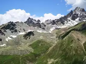 - Rugged mountain ranges framed by wispy clouds adorned the summits