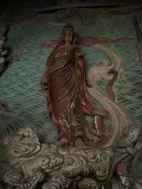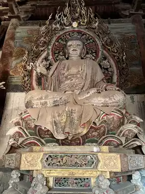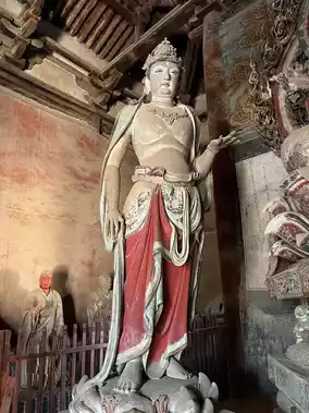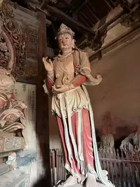 There is the "most beautiful Guanyin in China", Guanyin is behind the statue of Amitabha, lying on the door to look, the glass is also reflective, only to see the Guanyin's feet, the cute and lovely boy. The main hall is a double-eave Xieshan-style building, which enshrines the three saints of the West: Amitabha, Mahasthamaprapta, and Guanyin, all of which are original works when the hall was built. These statues are exquisitely crafted and have solemn expressions. It is particularly difficult for large clay sculptures to be preserved in the original site of the Buddha Hall. The whole group of statues is beautiful in shape, smooth in lines, harmonious in proportion, rich in color, and elegant in style, which can be traced back to the Tang and Song Dynasties.
