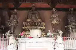 The existing Main Hall was built in the Yuan Dynasty and was renovated in the Qing Dynasty. It is five bays wide and has a single-eaved hanging roof. There are colored sculptures from the Song and Jin dynasties on the altar in the hall, including Rinpoche, Sakyamuni Buddha, Vairocana Buddha, and the attendant Guanyin, Ksitigarbha, Manjusri, and Samantabhadra. Above the colored sculptures, there is a group of suspended sculptures in the same position and sequence on the beams, which are miniature versions of the Three Bodies of Buddha and Four Bodhisattvas, but some of the statues have been lost or damaged. The beams are painted with colorful paintings, and there is also a group of exquisitely carved stone lions and statues in the hall. There is a side hall on each side of the Main Hall, which was newly built on the original site in the later period and has now been transformed into an exhibition hall with information about the history of Longxing Temple.