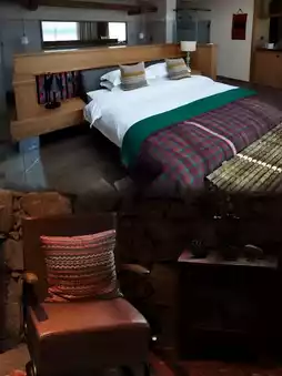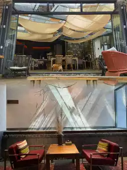 🏡 The homestay's design is unique, using six century-old trees as boundaries and scenery, combining modern craftsmanship with natural materials, preserving the original appearance. The stone walls and logs create a rough texture with natural patterns, and the rich color layers add warmth to the space.