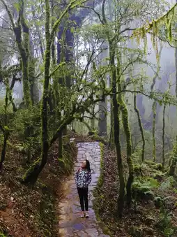 2️⃣ A circular stone-slab walking trail is completely shaded by the overhead forest. Looking up along the glistening moss on the tree trunks, you'll see branches and leaves swaying in the wind. Walking among the withered vines and ancient trees, your head touching orchid leaves and your feet stepping on medicinal herbs, you'll pass by Leigong trees, Jiziqing, Malugou, Baoziqing, moss forests, wild boar forests, bear dens, and more, as if you've entered a prehistoric wilderness.