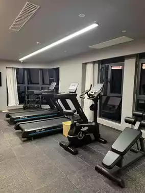 Gym: Equipped with fitness equipment, towels, and mineral water.
