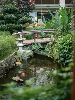 Small bridge, flowing water, green plants, koi carp🐠