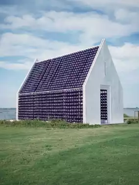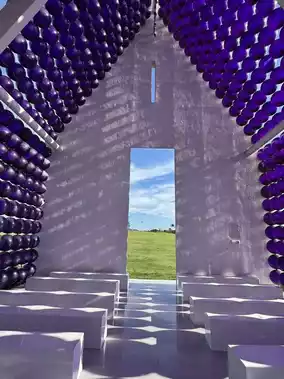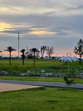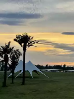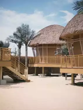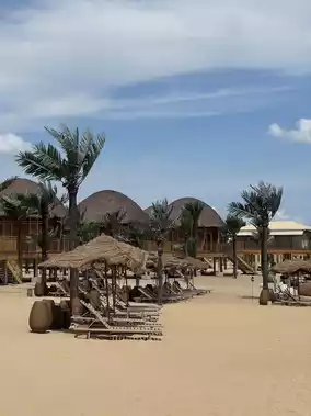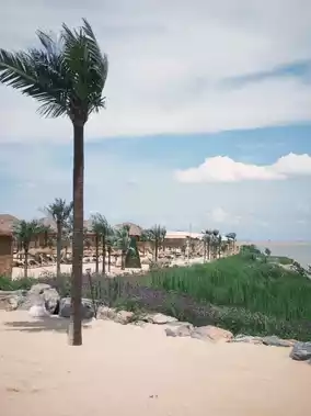 Beach, lawn, sea, sunshine, lounge chairs, tents, mushroom houses