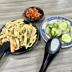 We ordered Wuhan hot dry noodles $80, Shaozi dry noodles $85, tomato, tofu and egg drop soup $60, smoked bean curd skin $40, cucumber $35, and blanched vegetables $40.