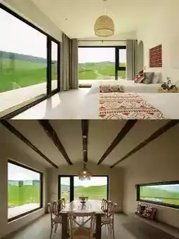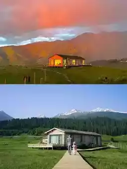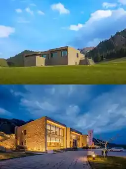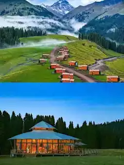 Located within the Qiongkushitai scenic area, it combines snow-capped spruce, grassland valleys, and felt wooden houses. There are large floor-to-ceiling windows for a 360° unobstructed view of the alpine meadows.