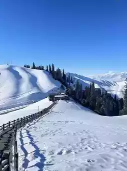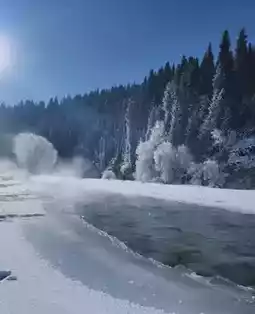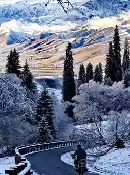 In October, Nalati transforms into a pristine and majestic icy wonderland, draped in a blanket of snow. The grasslands and mountains are covered in a thick layer of white, with the once lush green plains now adorned with a soft, white carpet. The rolling mountain ranges glisten under the sunlight, exuding a sacred brilliance. Rivers freeze into crystal-clear ice, while the towering spruce trees stand tall amidst the snow, creating a harmonious contrast with the blue sky and white snow, resembling elegant ink wash paintings.