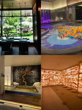 Indoor "whirlpool massage pool" → Outdoor "scenic medicinal bath" → Volcanic rock sauna room