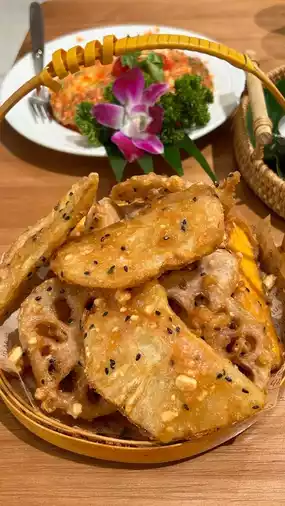 Lotus root slices, sweet potatoes, taro and pineapple are coated with batter and fried tree tree delicious 😋