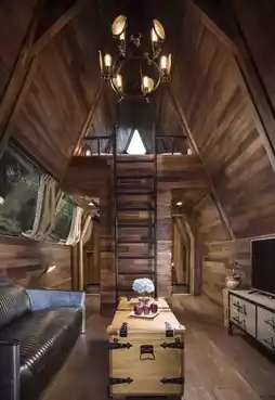 These uniquely shaped treehouses feel like a fairyland, like going on an adventure as a child. The round window design makes the "space capsule rooms" feel less cramped.