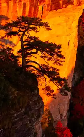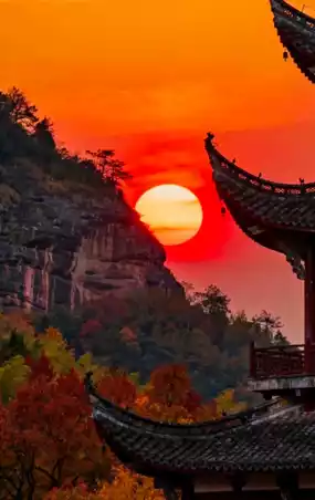 The cliff inscription "Heaven Opens Divine Beauty" still exudes immortal aura; inside the red rock cave lie the relics of Taoist monks’ pure cultivation, and the red cliff glows like blazing flames in the sunset.