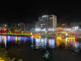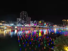 - Riverside Scenery: Gongshui River is the core of Xuan'en night scenery. At night, the river sparkles under the lights. The "Dragon Tour Gongshui" boat lights shine brilliantly, like golden shadows winding over the water. Riverside buildings such as the Miao ethnic clock tower, Tujia Moda building, and Dong ethnic wind and rain bridge are bathed in golden light, with flying eaves and upturned corners glowing, and the corridor pillars reflected in the water, blending ancient charm with modernity. In addition, a 70-meter-high musical fountain dances to the melody, adding a dreamy color to the night view.