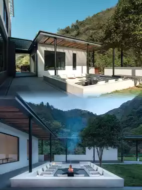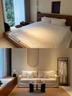 The homestay is backed by mountains and faces a stream. It was designed by a professional homestay design team. The overall architecture is mainly white, with some dark gray. The exterior is simple and elegant, and looks fresh and natural against the green background. The interior is decorated in the popular wabi-sabi style, which is simple and elegant yet fashionable.