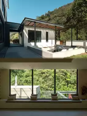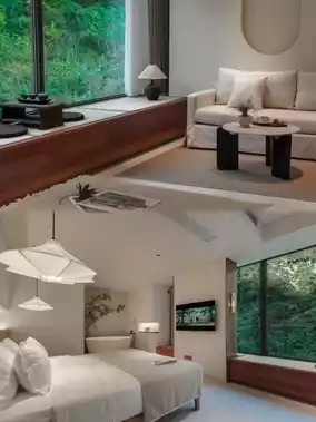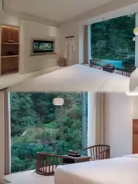 The homestay is hidden in a bamboo forest halfway up the mountain, with a white and dark gray color scheme that’s simple, elegant, and perfectly blends with the surrounding greenery! The interior features a wabi-sabi style—minimalist yet relaxing, every photo you take looks amazing. Lying in bed, you can watch the mountain mist flow through the huge floor-to-ceiling windows, instantly cutting your work fatigue in half!