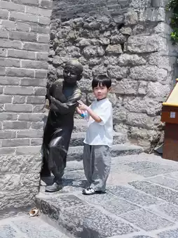 A 10-minute drive 🚗 from the hotel to Hubushan, very pleasant to stroll in the evening. Blue stone slab roads, red lanterns, the kid watched the pancake vendor auntie for a long time, and we took a very interesting photo with street characters. The old mother slowly wandered along, full of local life atmosphere. Walking around Hubushan, Xuzhou’s local food specialties are great too—rolled pancakes, meat sauce rice noodles, with rich meat sauce soaking into soft noodles, paired with a spoonful of chili oil and cilantro.