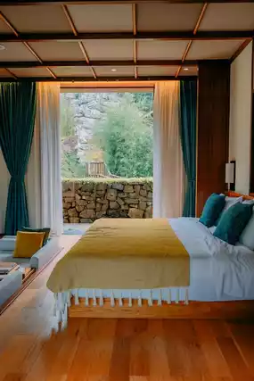 🚪Through the long wooden plank road of the gate, the wooden boards under your feet creak and creak, making an ancient sound. Walking into the lobby, the unique courtyard skylight design fills up the first impression. Because it is an independent courtyard distributed on the mountainside🏘️, there will be shuttle buses to pick up and drop off.