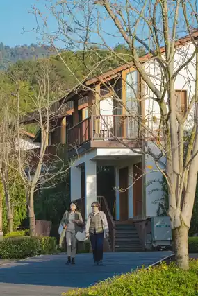 🍂In autumn, the green flower beds, red maple leaves, and yellow ginkgo trees dye the entire hotel into a colorful painting🖼️, plus the scattered distribution of houses with white walls and black tiles, walking among them, it is like walking in the mountain villa where Wang Yuyan of Gusu Mountain lives.