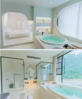Each room is equipped with Evian mineral water, Dyson hair dryer, smart toilet, bubble pool... The cost performance is quite high, the whole house is micro-cement Chaji wind design, every detail in the guest room is full of style! Lying on the bed, you can see the sea of clouds and sunset, forest wild.