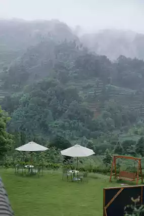 The scenery around in the misty rain is as beautiful as an ink painting.