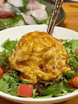 It's no exaggeration to say that I planned my trip to Kitakyushu just to go here. This is a restaurant I definitely wanted to go to. I made a reservation more than half a year ago and made plans for my trip. This is a super popular restaurant in Kitakyushu that has been ranked #1 in the Tabelog Izakaya category and is also one of the top 100 restaurants in Japan. I started by eating sashimi, which was very fresh, thick, and filling, and I was surprised at how delicious it was from the start. The salad was topped with a fluffy, runny egg, and was as filling as an omelette. It was difficult to eat with chopsticks. It was so heavy that I couldn't even lift it🤣