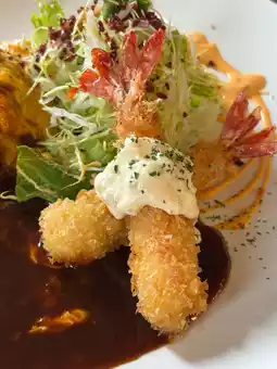 The service was impressively quick, yet the piping hot Omurice and fried shrimp were absolutely delicious!
