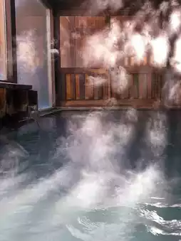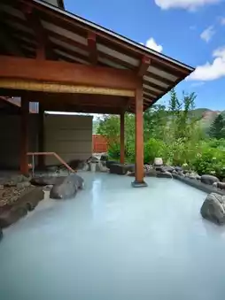 This elegant hot spring hotel is built on the shore of a tranquil forest lake. You can enjoy the milky white natural hot springs while overlooking the majestic mountains. There is also a large public bath with a sauna and an open-air bath.