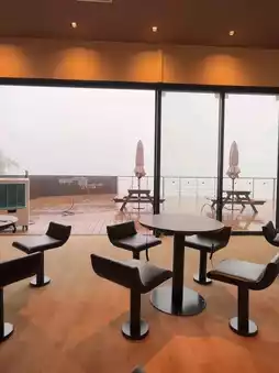 The tables inside the store are equipped with not only power outlets but also USB ports, making it convenient for quick charging. The restrooms are also well-maintained, making it a safe place to bring children. Unfortunately, the weather didn't make for great photos, but on a clear day, the view from the terrace seats would be enjoyable.
