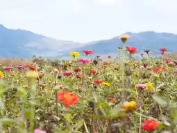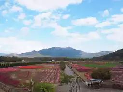Lake Yamanaka Hana no Miyako Park offers a variety of different views, including cherry blossoms, nemophila, and tulips in spring, and sunflowers and zinnias in summer.