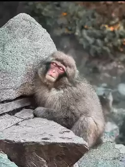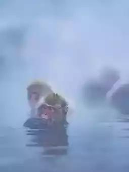 Set amidst the natural beauty of the mountains, the sight of monkeys enjoying the warmth of the hot springs is a soothing scene reminiscent of humans relaxing in a spa.