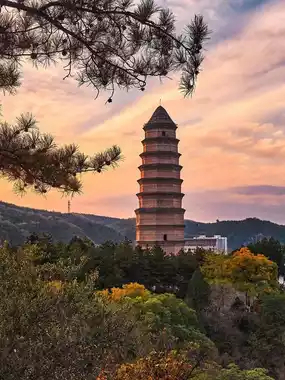 An ancient Ming Dynasty pagoda stands on the mountain top, a perfect blend of history and nature.