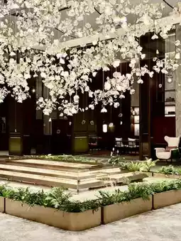 Walking to the outdoor garden, the breeze lifts the curtains of the four-cornered pavilion. Lotus flowers bloom on the lake spanned by a long bridge. The wedding lawn is lush and green. Black swans swim and raise their young among the pavilions and waterside terraces, with the sound of flowing water nearby. The symmetrical corridor pillars on both sides of the conference area perfectly showcase Chinese aesthetics. The layered and staggered landscape design reflects the designer’s thoughtfulness. Guests can also play badminton and basketball at the wellness center in the middle of the garden.
