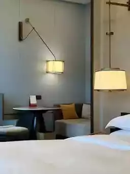 The hotel is located beside the picturesque Dayang Bay, not far from Nanyang Airport. In the evening, traveling from Yancheng Station to the hotel, you can still see the sunset. The hotel overall adopts a garden style with white walls and black tiles. Two Luohan pines stand on either side of the lobby, with glazed golden fragments cascading from the ceiling. The lobby bar offers a happy hour in the evening, and the grand piano and huge teddy bear attract attention. The gym on the same floor has anaerobic separation, and the heated swimming pool is paired with a hot spring pool, making the facilities impeccable.