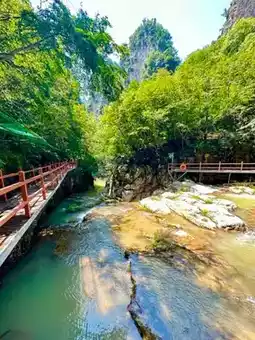 The Mang River is the core attraction of the scenic area. It is a clear river with towering mountains on both sides, offering a spectacular view. Tourists can enjoy rafting, boating, and fishing on the Mang River.