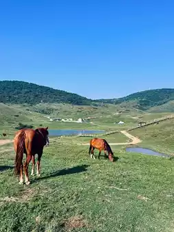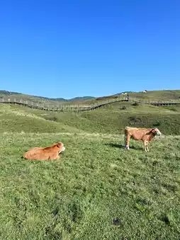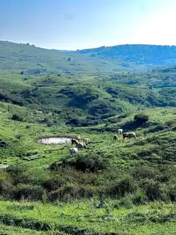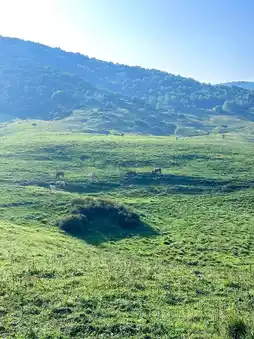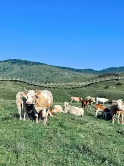 The whole way is full of blue sky, high mountains, grasslands, cattle and horses