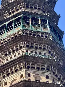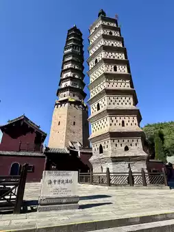 |Rare in the World. Haihui Temple was first built in the Sui Dynasty. In the Tang Dynasty, Emperor Zhaozong of Tang, Li Ye, gave it the name "Longquan Zen Temple," and Emperor Taizong of Song, Zhao Guangyi, gave it the name "Haihui Temple." There are two pagodas in Haihui Temple. The shorter one is called Liang Pagoda, which was first built in the second year of Longde in the Later Liang Dynasty of the Five Dynasties. It was a pagoda built to commemorate the relics of Master Shunfan, the builder of the temple. The taller one next to it is called Ming Pagoda, which was built in the 44th year of Jiajing. It is a 13-story octagonal brick pagoda. Since the 10th floor of the pagoda has a circle of glazed flat seats in the style of a hanging pavilion, it is also called the Glazed Hanging Pavilion Pagoda. Usually, the pagoda that can be visited is the taller one, but the aisle is a bit narrow. The view from the top is truly spectacular, with a bridge spanning two mountains on one side and the recently renovated Haihui Temple on the other. A fee of CNY 30 is required to climb the pagoda.