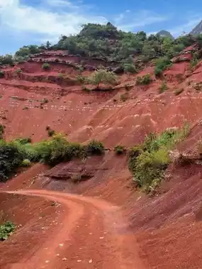 🌈The Danxia landforms at Hongshaling are breathtaking. The blood-red sandstone grains shine brilliantly under the sun, creating a striking contrast with the surrounding green vegetation.
