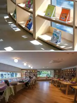 In the season of autumn, when the sky is clear, let's enjoy the leisure of reading in a library that embraces architectural beauty and nature.