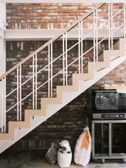 This cozy bakery cafe features warm-toned brick walls and a clean, laid-out table layout, creating a comfortable space for a relaxing stay.