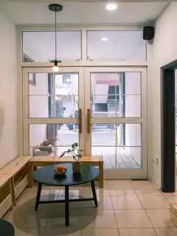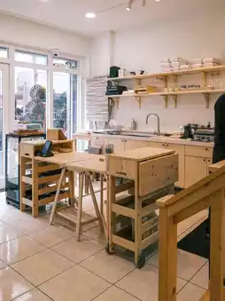 On the first floor of a red brick building, the clean and cozy white and wood interior is captivating, with a long coffee bar and a sensual duplex layout. The independent tables spaced across a small passageway add to the tranquility.